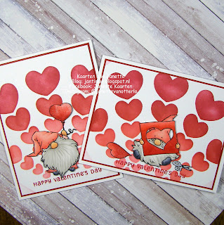 En ook weer lekker allerlei merken door elkaar gegooid. De Gnomes zijn stempels van Whimsy Stamps (Gnome one like You), de tekst-stempel is van een set van Colorado Craft Company. Het stencil is van Simon Says Stamp (Radiant Heart) en de gebruikte inkten zijn van Pinkfresh Studio.